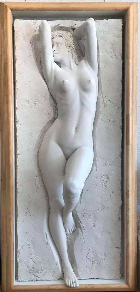 "Calling my artwork bas-relief," Mack says, "is incorrect since bas-relief technically refers to low relief sculpture. My art, in fact, has more physical depth than high relief; it incorporates various elements in full-round rising toward the viewer as in my "Illusion" image where her leg leaves the background extending into space. Technically, sculptures combining various levels of relief and full-round parts are called 'Alto Relief' sculptures.