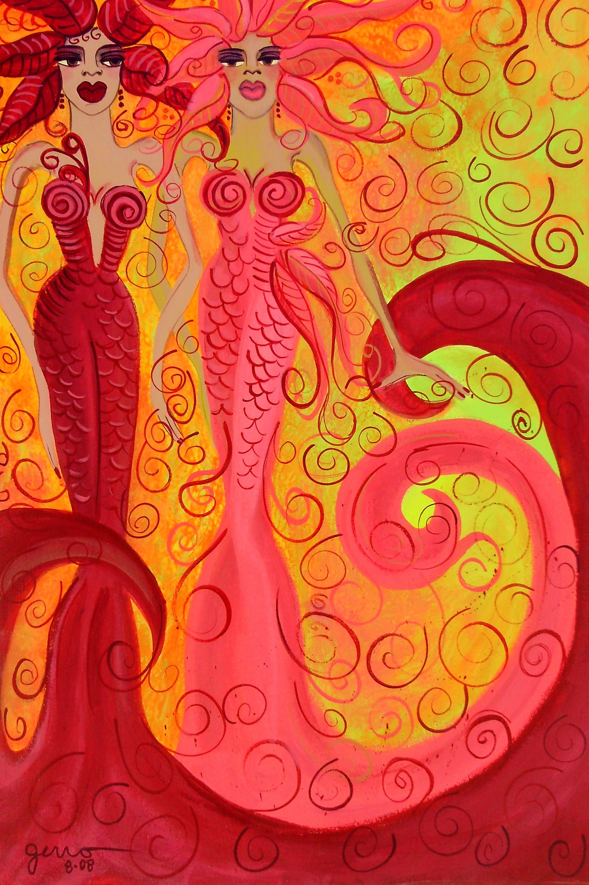 Helen Gerro’s back ground is fashion design followed with painting art since the eighties, her couture inspired paintings jumped off her canvas’s onto her designer fashions. Thus making original one of a kind hand painted postmodern statement making designer dresses which is a piece of art in itself. Gerro's paintings are bold, colorful, figurative, glamorous, whimsical paintings of the female form inspired from being a fashion designer.