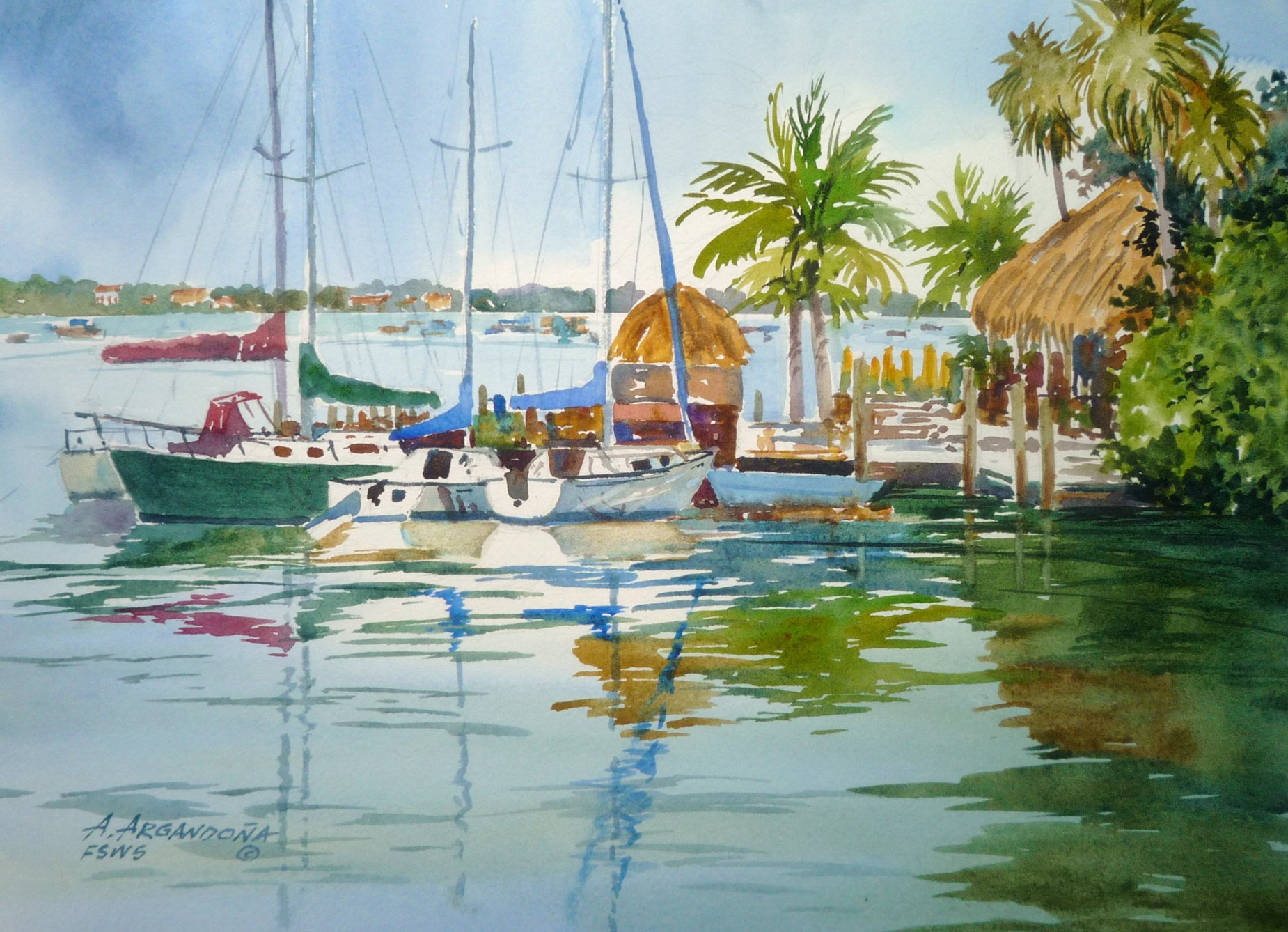 Augusto Argandoña is a well known artist who has gained recognition for his crisp and realistic watercolors. With a degree in Industrial Design from California State University, he has practiced his profession for 20 years all the while pursuing his passion for painting. While working as a Designer he started painting watercolors as a hobby, as his skill expanded, he began doing paintings for relatives and showing his art publicly. The positive response his work received fueled his enthusiasm and in 1990 he began a new career painting full time primarily in watercolors. Based on his formal training as a Designer, Argandoña has developed a distinctive painting style which has wide appeal and provides him with many opportunities to use his talent. His artistic versatility and expertise in the challenging medium of watercolors coupled with his approach at marketing his art has won him a feature article in the June 1992 issue of North Light Magazine, an art publication with national circulation. Previously a resident of East Aurora, NY, Argandoña moved to Sarasota, FL. in 1997.