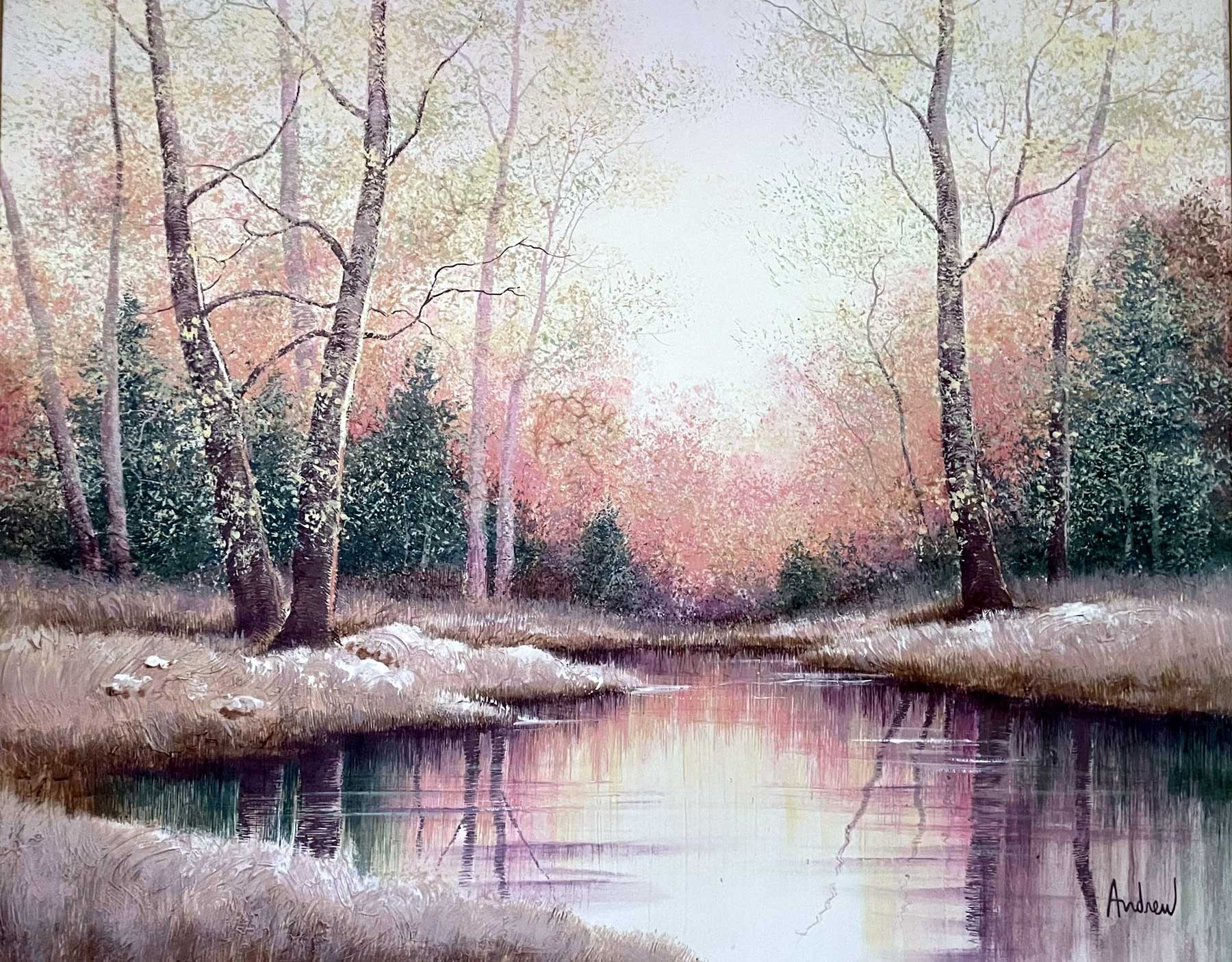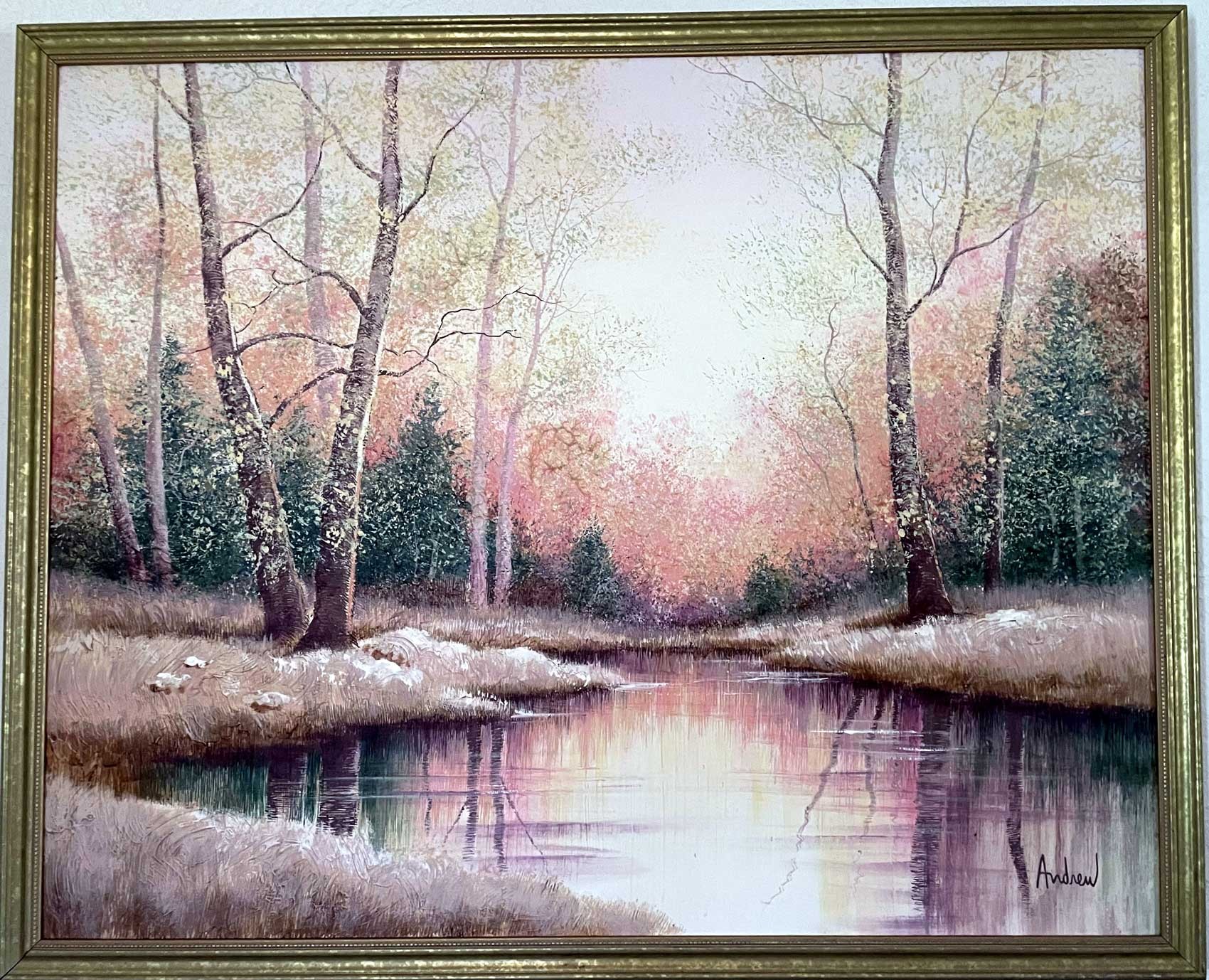 53 1/4 by 43 1/4 in the frame, which is gold finished. Not much info except purchased in Lehigh in the late 90s