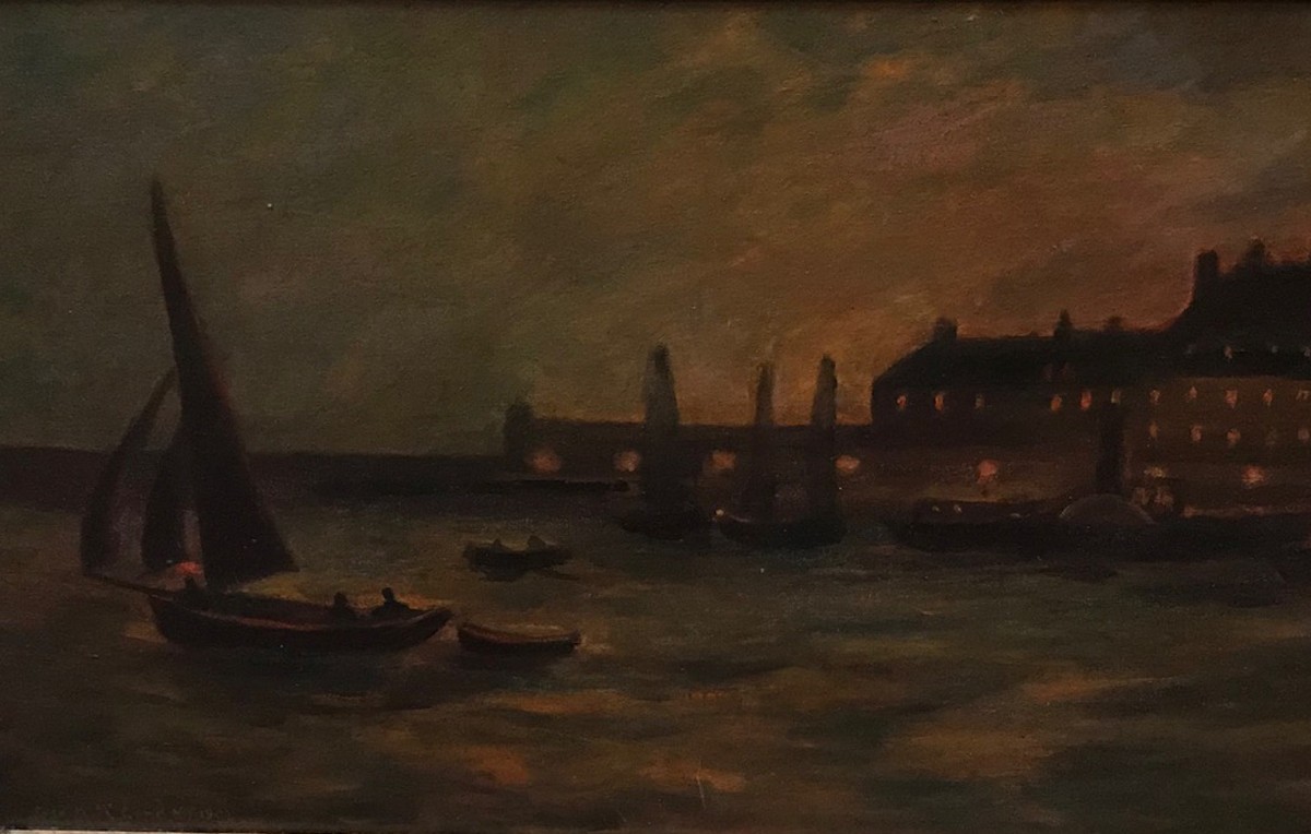 Size: 24x33 inc. frame Medium: oil on canvas. Scene: New York harbor