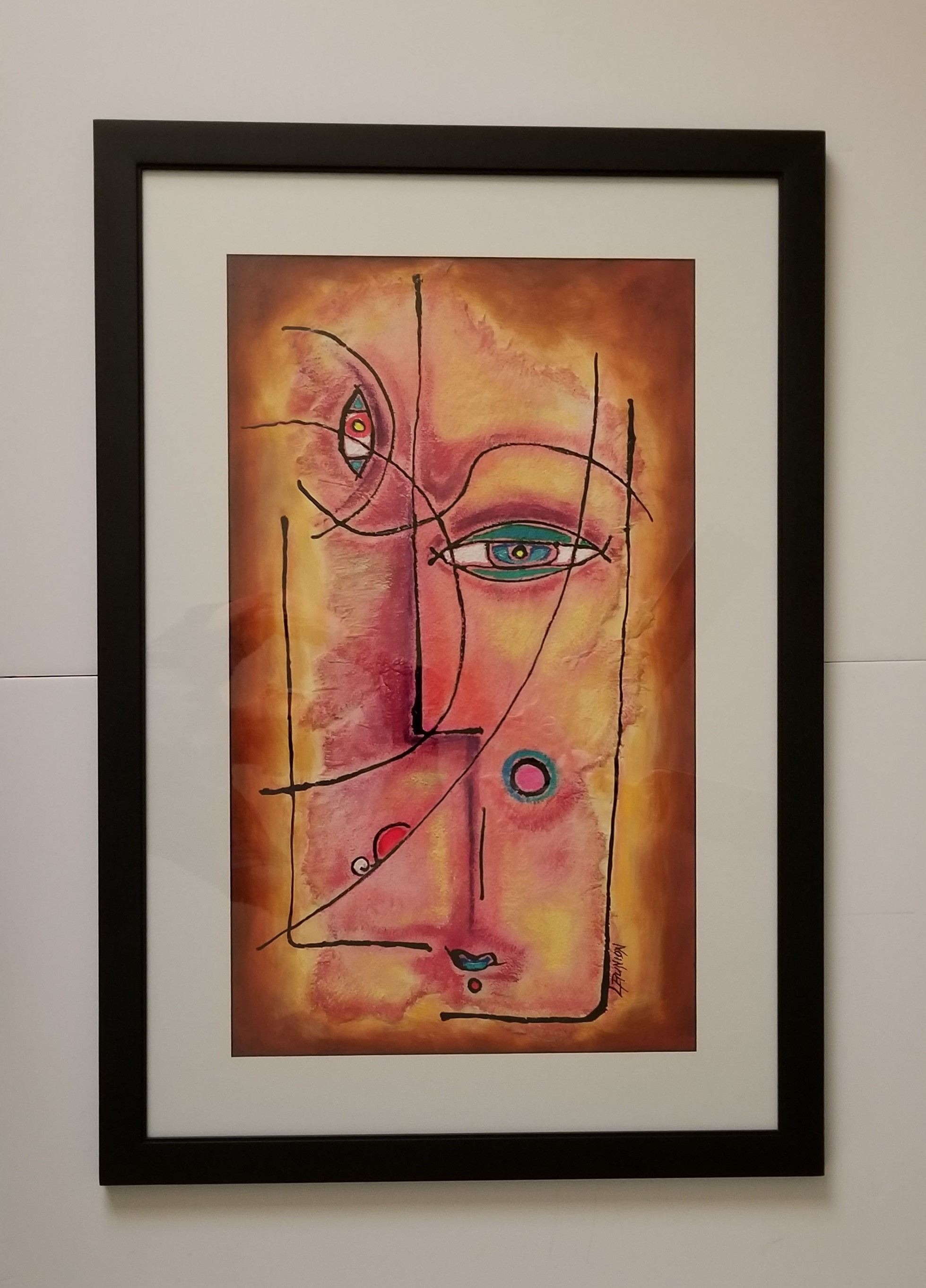 Acrylic and mixed media on watercolor paper, matted and framed. Frame 38.75x27 outside dimensions, image size 30x18.